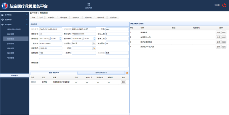 按照中国航空医疗救援联盟工作安排,我公司承担了航空医疗救援1.0版系统软件的开发,开发工作从2021年3月中旬开始,至2021年5月25日结束。系统包括救援申请APP、值班系统、主任医生业务系统、运控调度系统四部分组成,具有急救、转运、救援、保障、演练等主要功能,能够初步承担航空医疗救援任务。