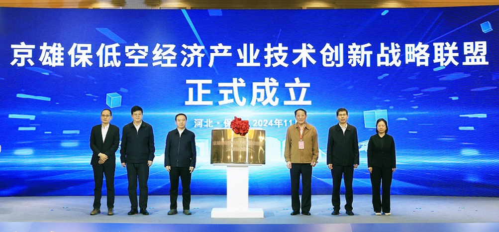 中国信息协会通用航空分会会长王砥、雄安新区管委会副主任丁晓龙、北京市房山区副区长任世强等为“京雄保低空经济产业技术创新战略联盟”揭牌。