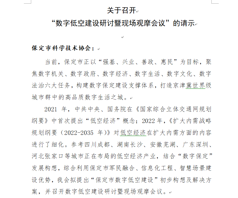 会后,由刘贺普同志主笔,起草了《保定市数字低空发展设想》、《关于召开“数字低空建设研讨暨现场观摩会议”的请示》等报告,准备由保定市科协或数投公司上报给保定市政府主管领导,择机召开正式研讨会及现场观摩会,拉开保定市数字低空发展的大幕。